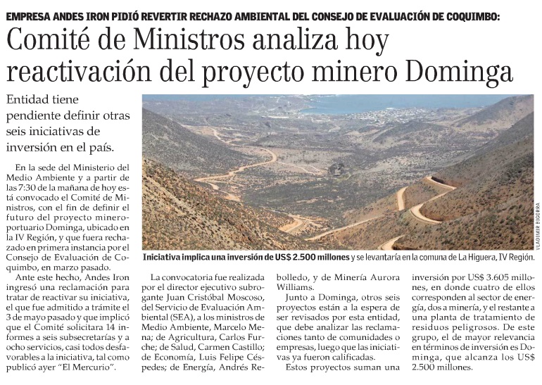 Comité de Ministros verá el lunes Dominga - (El Mercurio de Santiago)