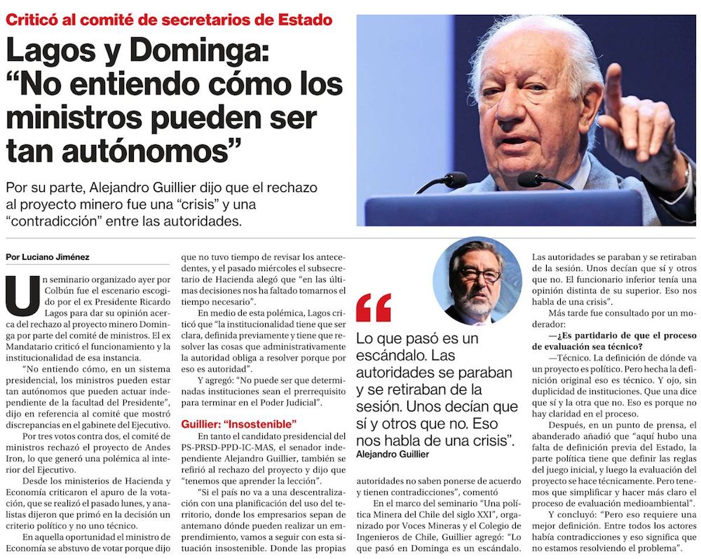 Lagos lanza dura crítica al rol del Comité de Ministros y cuestiona su autonomía - (La Tercera)