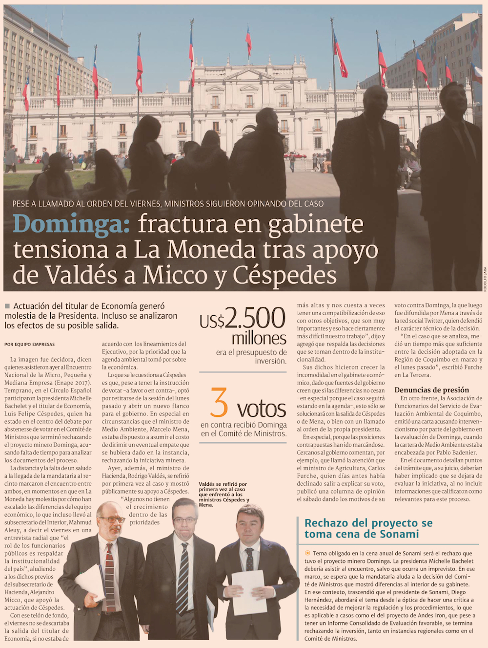 Quiebre en el Gobierno se profundiza, a una semana del rechazo de proyecto Dominga - (El Mercurio de Santiago)