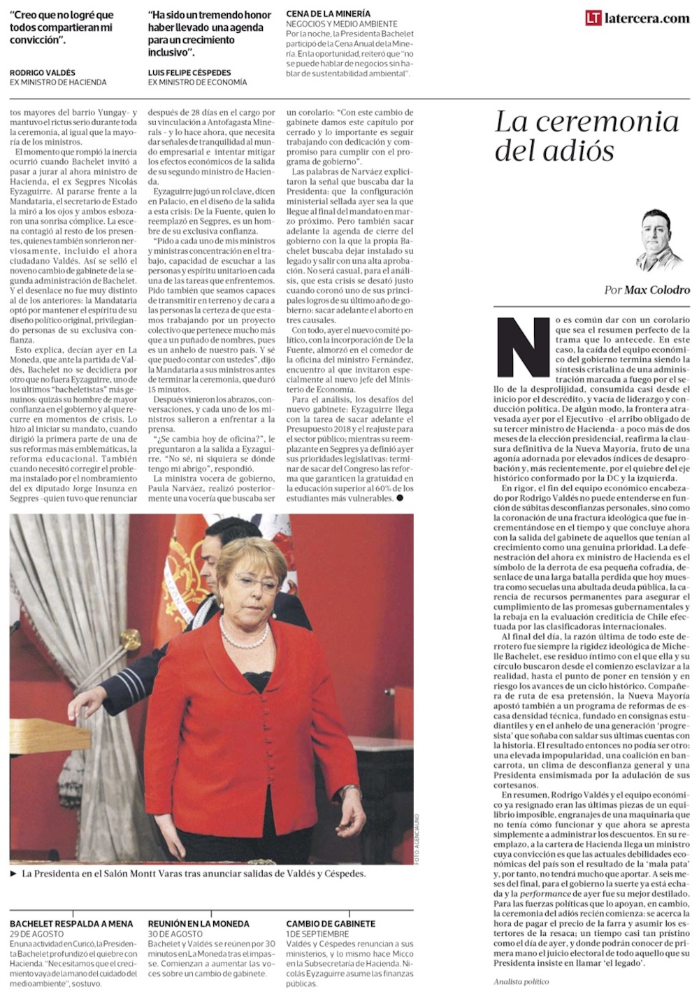Eyzaguirre reemplaza a Valdés en Hacienda y asegura que su prioridad será el crecimiento: “A buen entendedor, pocas palabras” - (El Mercurio de Santiago)