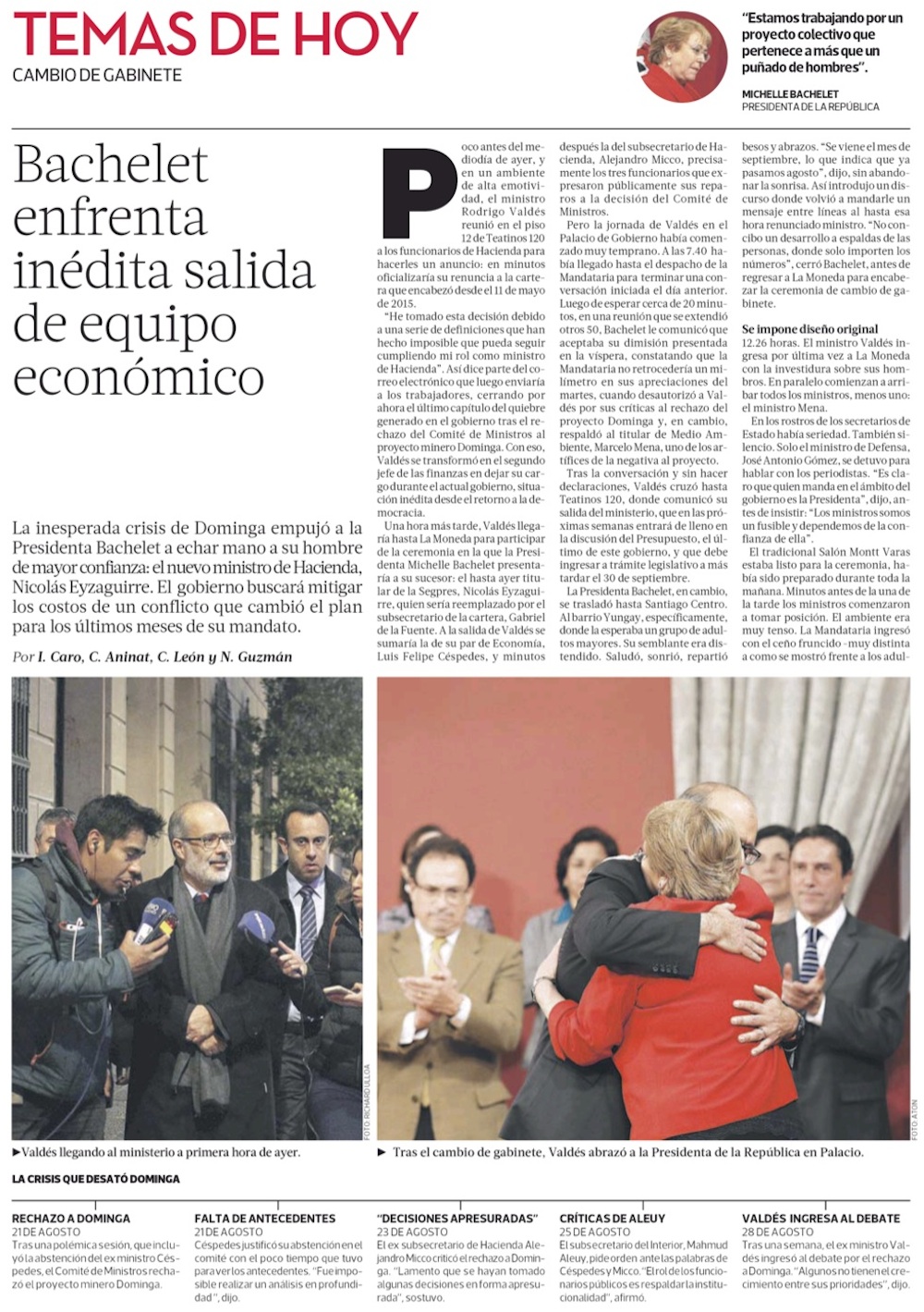 Eyzaguirre reemplaza a Valdés en Hacienda y asegura que su prioridad será el crecimiento: “A buen entendedor, pocas palabras” - (El Mercurio de Santiago)