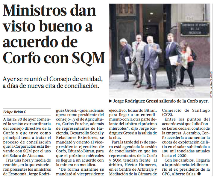 Corfo entrega mandato a Britan para conseguir un acuerdo con SQM - (Medios Regionales Cadena El Mercurio)