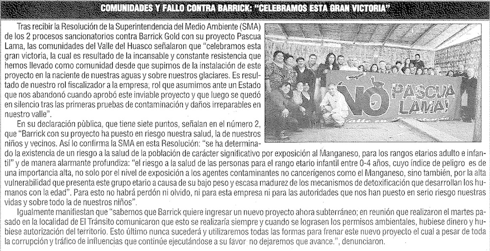 Sonami: “Respaldamos los esfuerzos de Barrick para respaldar Pascua Lama” - (Estrella del Huasco)