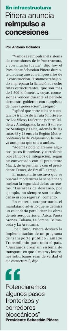 Presidente Piñera compromete licitar ocho carreteras, seis aeropuertos y trenes suburbanos - (El Mercurio de Santiago)