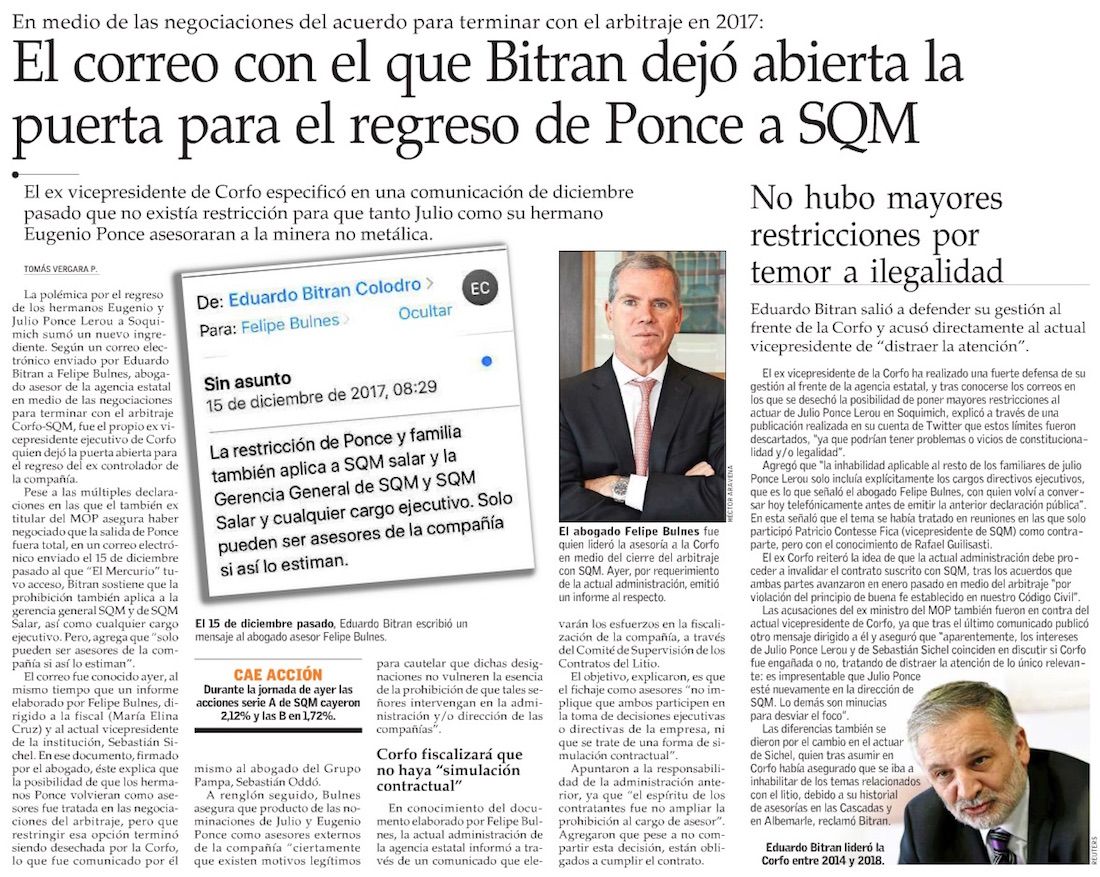 Corfo y SQM afirman que Bitran conocía y aprobó opción de que Ponce asesore a la minera - (Pulso)