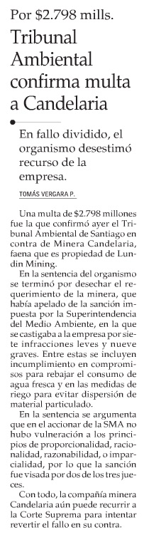 Tribunal Ambiental de Santiago confirma sanción de $2.798 millones contra Minera Candelaria - (biobiochile online)