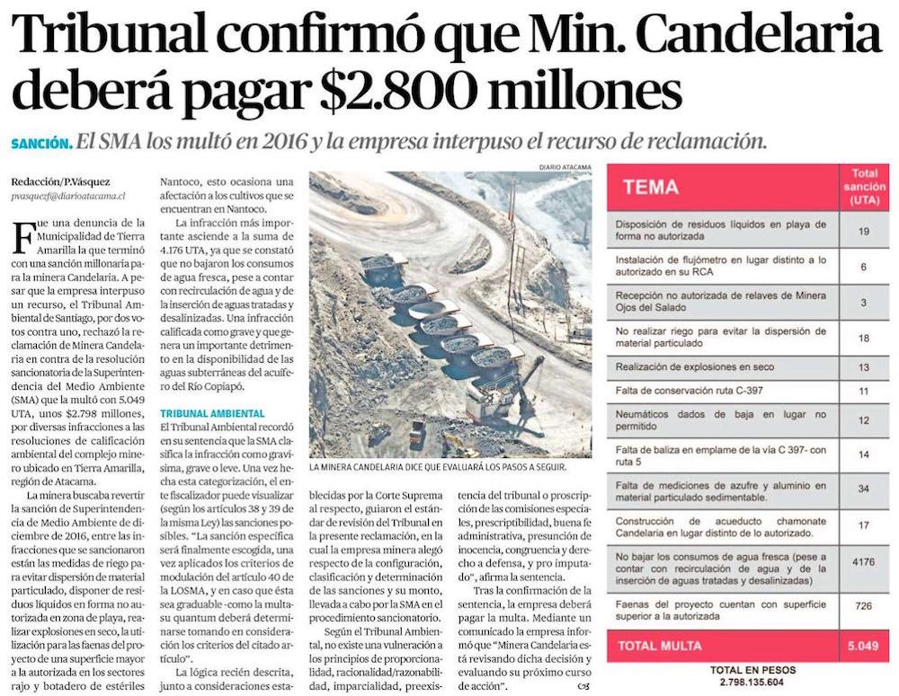 Tribunal Ambiental de Santiago confirma sanción de $2.798 millones contra Minera Candelaria - (biobiochile online)