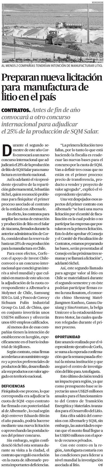 Corfo prepara una nueva licitación para la manufactura de litio en el país - (El Mercurio de Antofagasta)