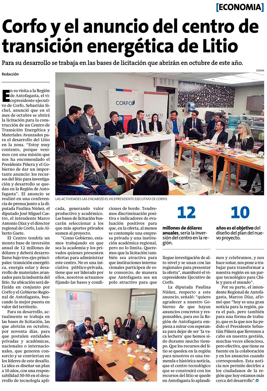 Corfo prepara una nueva licitación para la manufactura de litio en el país - (El Mercurio de Antofagasta)