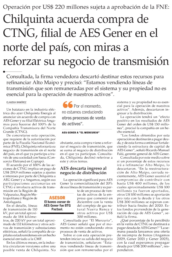 AES Gener venderá el 100% de su línea transmisora del Norte Grande a Chilquinta - (Pulso)