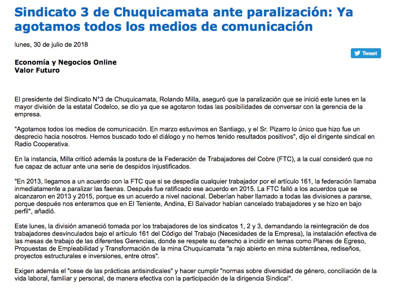 Trabajadores paralizan mina Chuquicamata: "Agotamos el diálogo, comienza la lucha" - (biobiochile online)