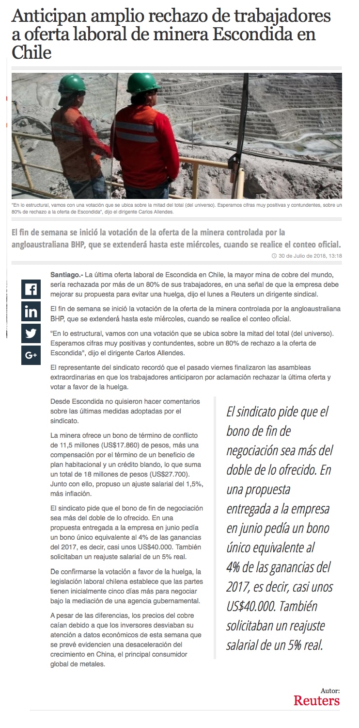 Sindicato de Escondida analiza "huelga inminente" pese a última oferta de la empresa - (biobiochile online)
