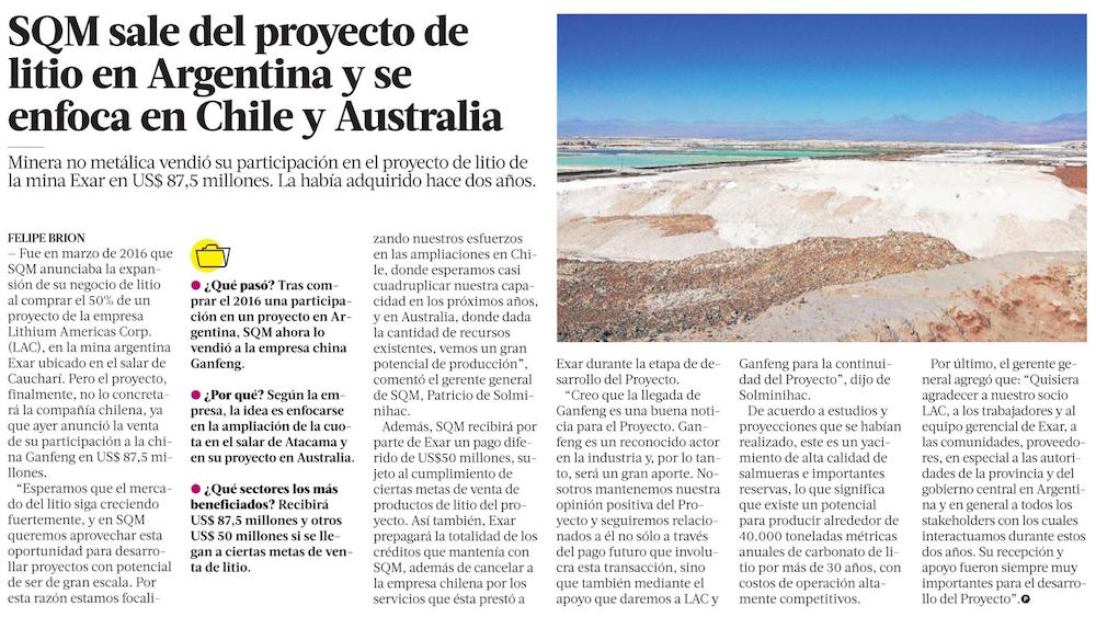 SQM vende a China Ganfeng participación en proyecto de litio en Argentina - (El Mercurio de Santiago)