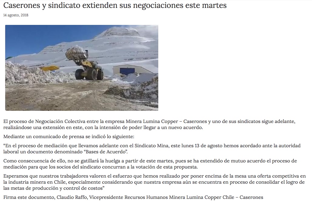 Sindicato de Caserones aceptó la última propuesta de la empresa con 96,7% de los votos - (El Diario de Atacama)