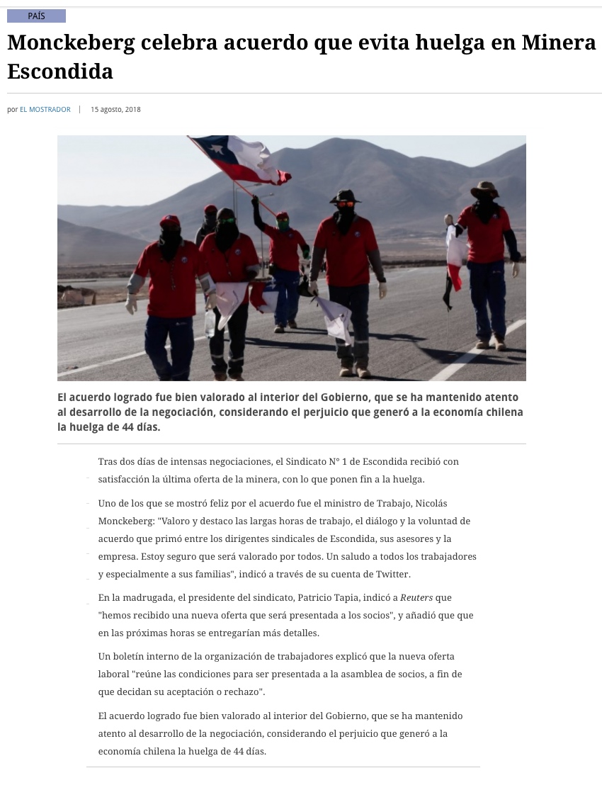Gobierno celebra acuerdo entre Minera Escondida y trabajadores: "Ha ganado el diálogo" - (cooperativa online)