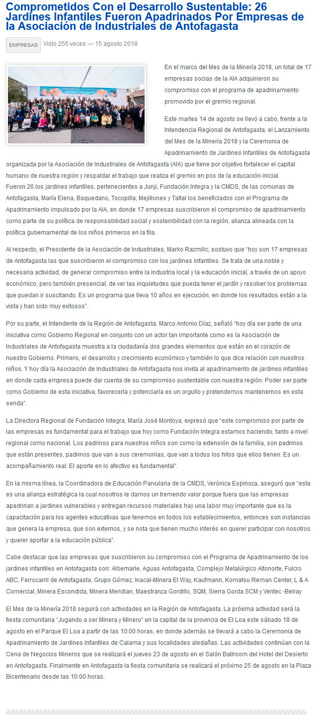 26 jardines infantiles de la ciudad fueron apadrinados por empresas - (El Mercurio de Antofagasta)