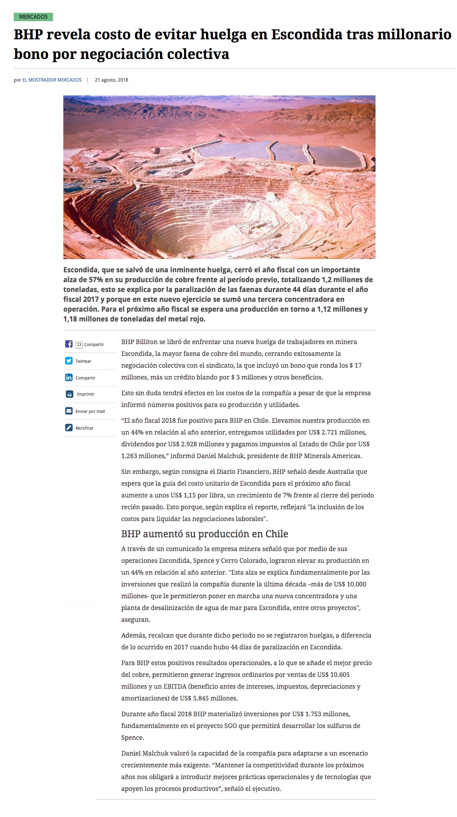 BHP Prevé alzas en costos de producción en Escondida de hasta un 7% tras el cierre de la negociación colectiva - (El Mercurio de Santiago)