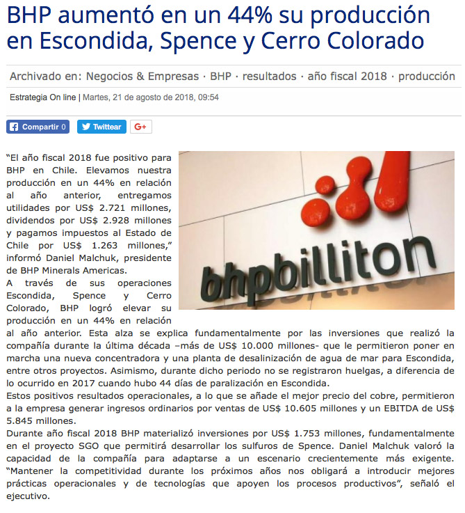 BHP logró utilidades por US$2.721 millones en Chile en año fiscal 2018 - (mch.cl)