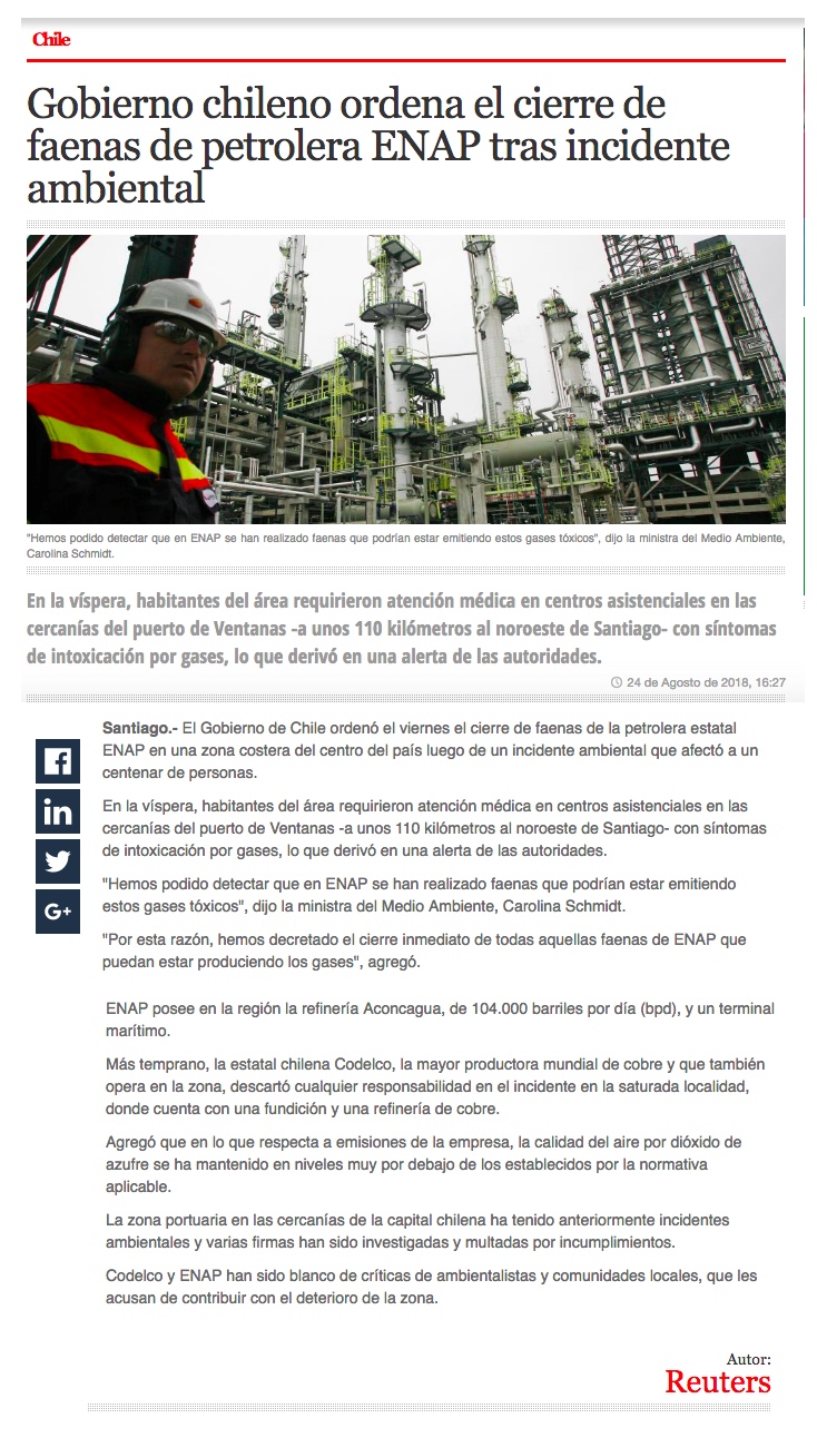 ENAP responde a cuestionamientos de la autoridad y asegura que no tiene responsabilidad en el episodio de Quintero - (DF Online)