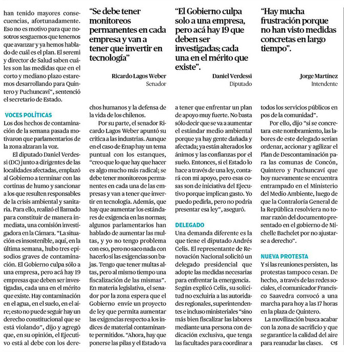 Ministros visitan Quintero y comprometen plan de descontaminación para fines de año - (El Mercurio de Santiago)