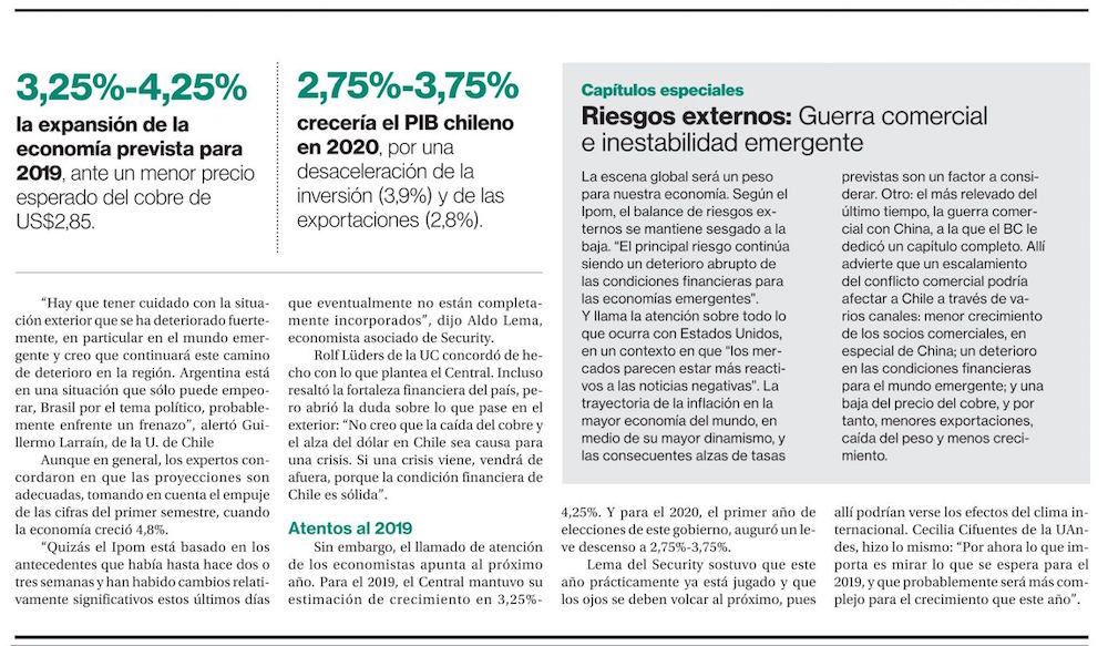 Banco Central eleva proyección de crecimiento para 2018 a entre 4% y 4,5%, pese a deterioro externo - (El Mercurio de Santiago)