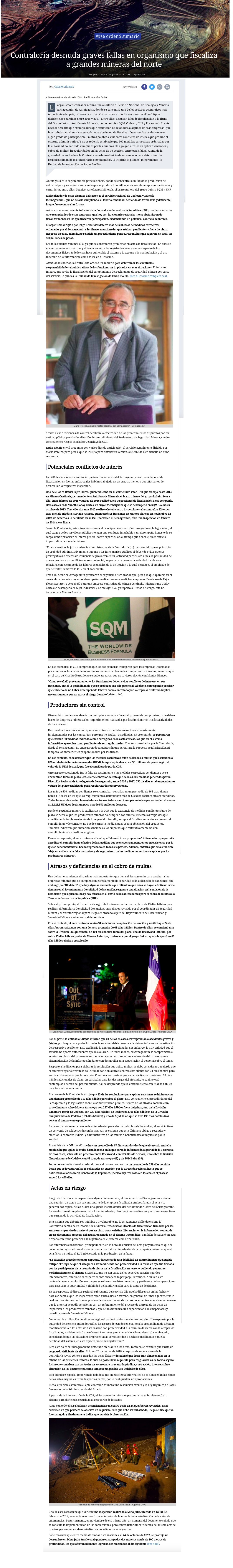 Informe de Contraloría detectó "manga ancha" de Sernageomin con las mineras de la región - (El Mercurio de Calama)