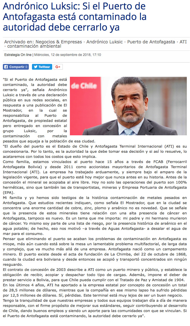 Luksic responde por contaminación atribuida a puerto de Antofagasta - (El Mercurio de Santiago)