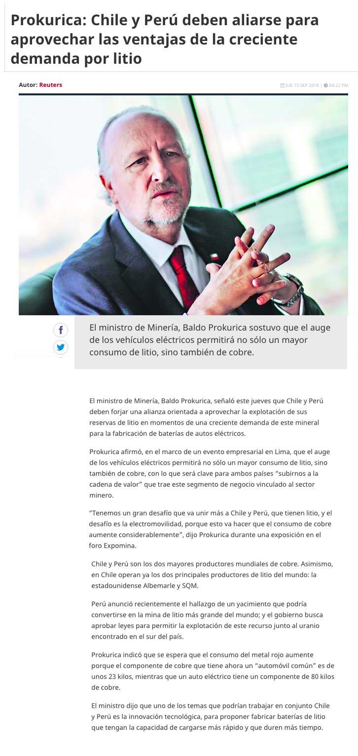 Ministro Prokurica: Chile y Perú deben forjar alianza por litio ante creciente mercado de vehículos eléctricos - (Estrategia)
