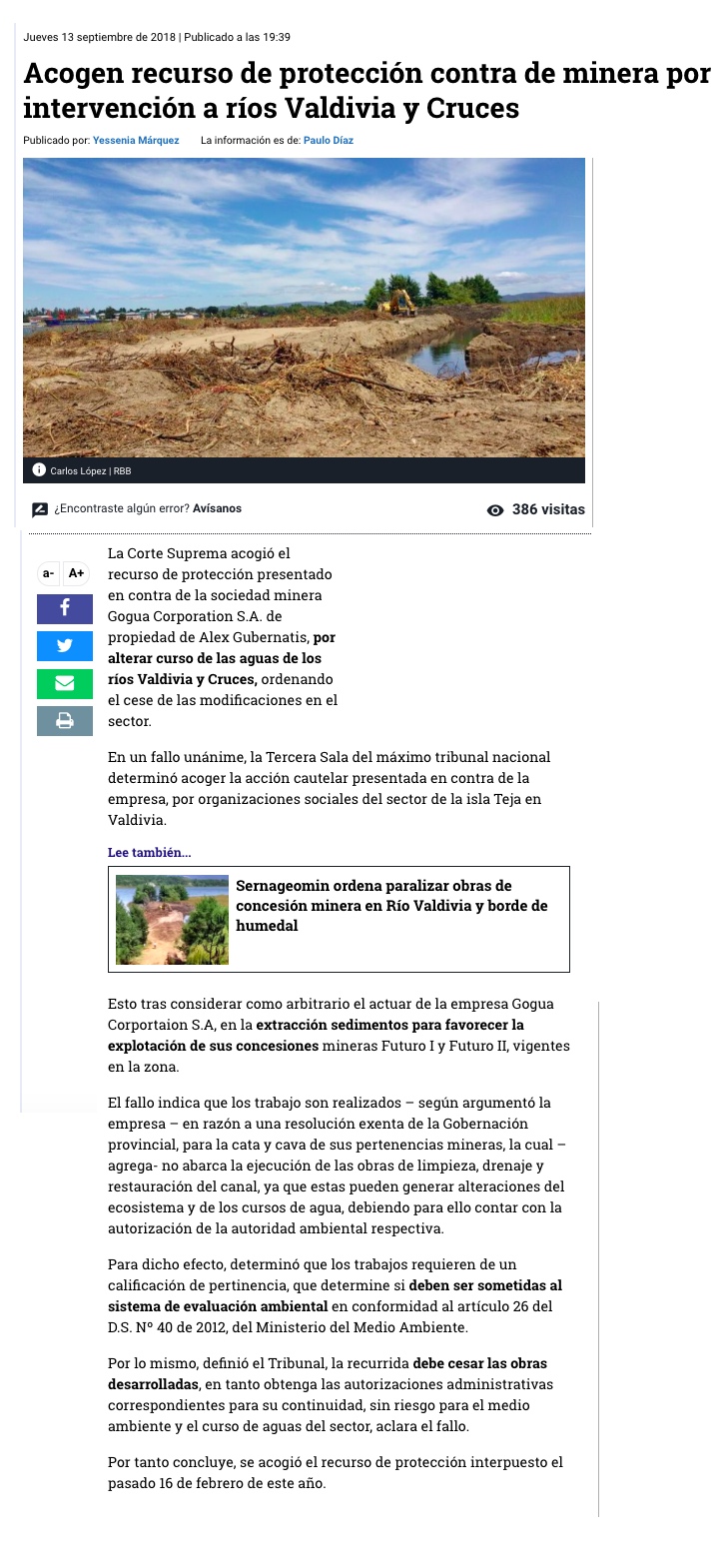 Acogen recurso de protección contra de minera por intervención a ríos Valdivia y Cruces - (biobiochile online)