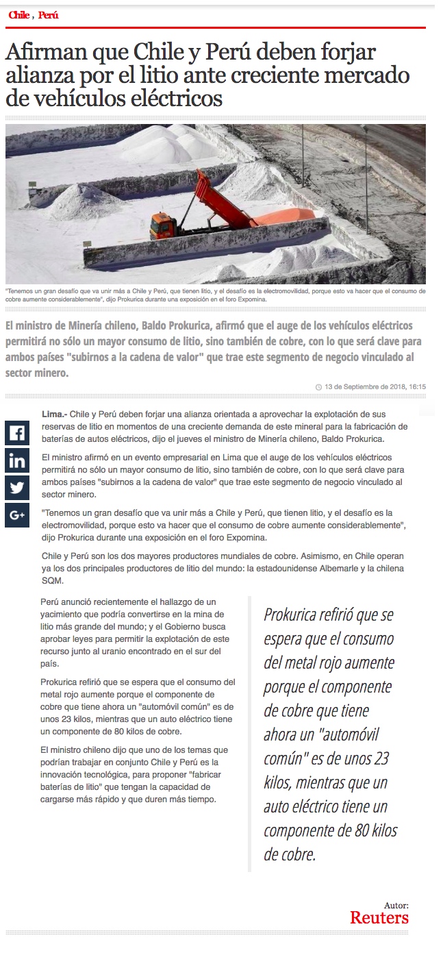 Prokurica: Chile y Perú deben aliarse para aprovechar las ventajas de la creciente demanda por litio - (Pulso Online)