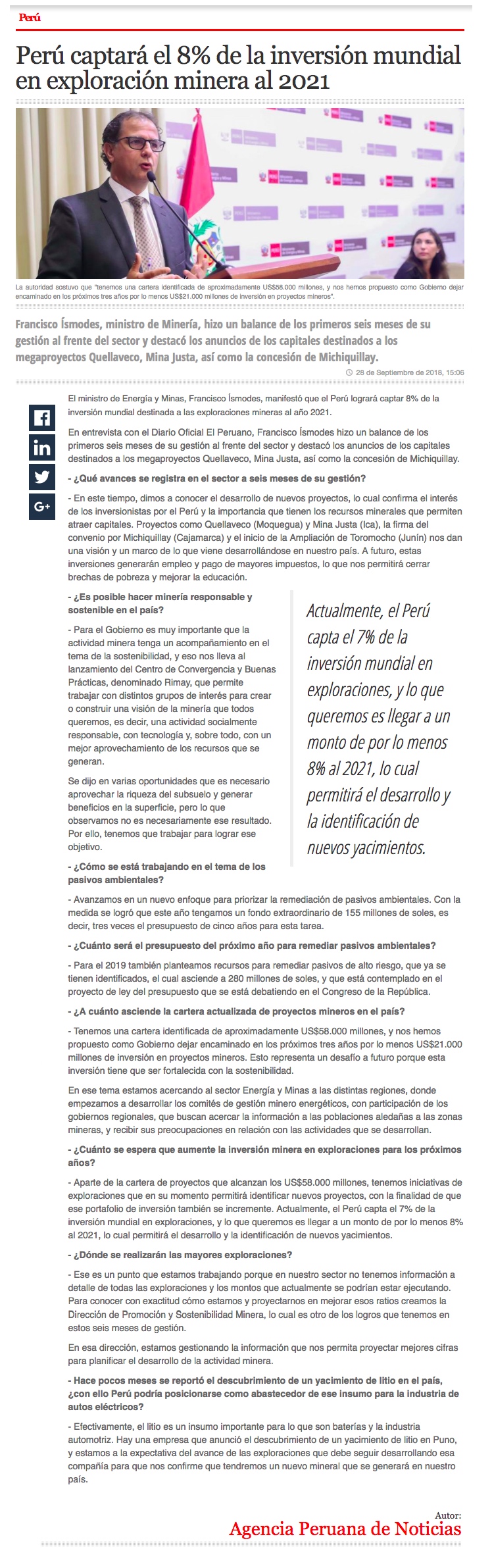 Ministro Ísmodes: “Perú captará 8% de inversión mundial en exploraciones mineras a 2021” - (latinominería)