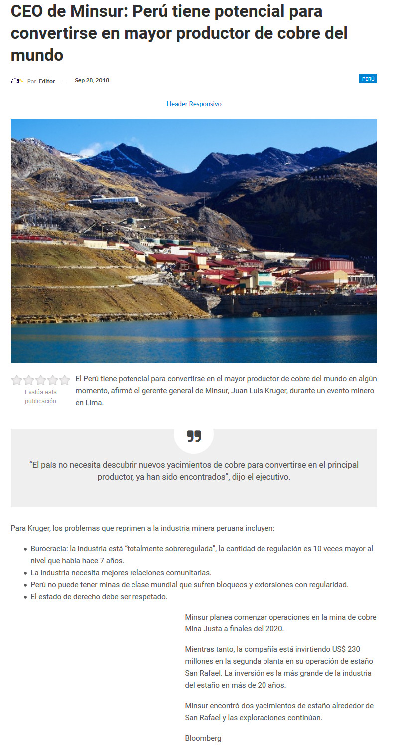 Perú confía en que puede superar a Chile y convertirse en el mayor productor de cobre en el mundo - (Pulso Online)