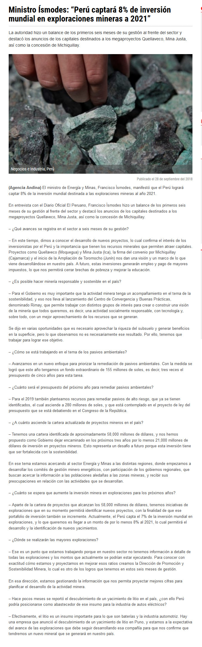 Perú captará el 8% de la inversión mundial en exploración minera al 2021 - (americaeconomia online)