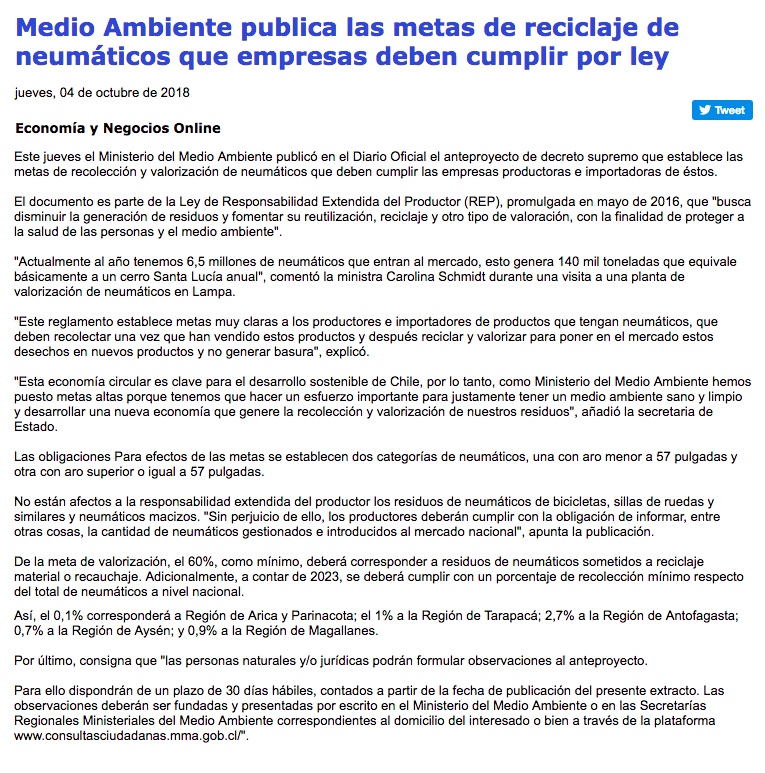 Primera meta de la Ley REP: 90% de los neumáticos se deben reciclar a 2028 - (Diario Financiero)