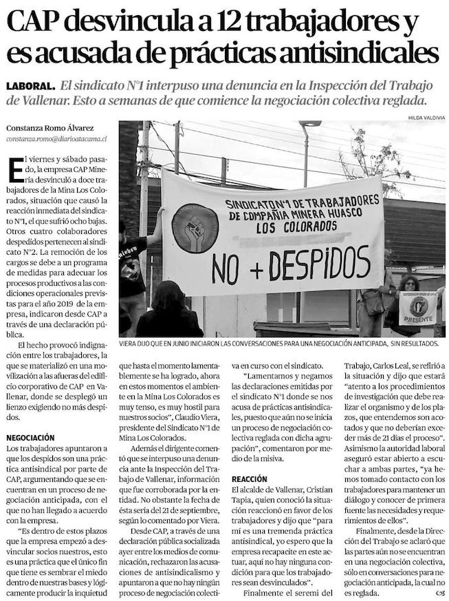 Vallenar: Sindicato protesta por despido de trabajadores de CAP Minería - (cooperativa online)