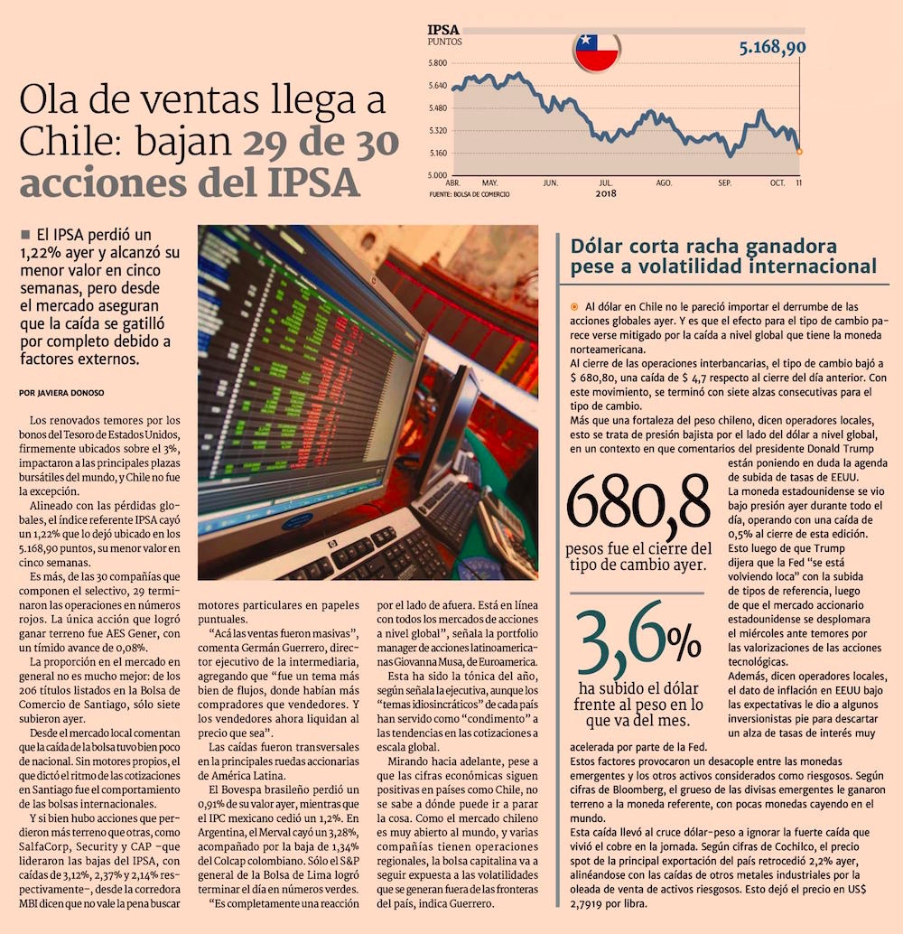 IPSA cae, arrastrado por derrumbe de bolsas globales que ceden ante alza de tasas del Tesoro y efectos de guerra comercial - (El Mercurio de Santiago)
