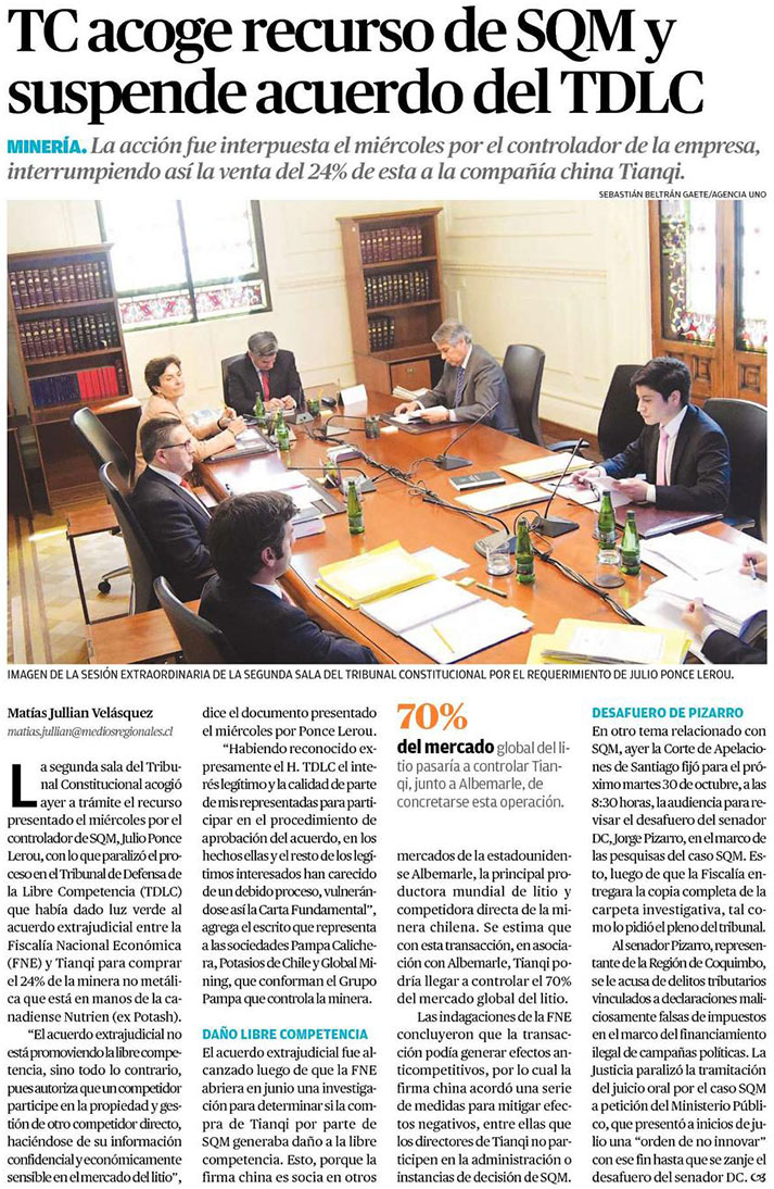 TC acoge a trámite requerimiento de Grupo Pampa para evitar ingreso de Tianqi a SQM - (El Mercurio de Santiago)