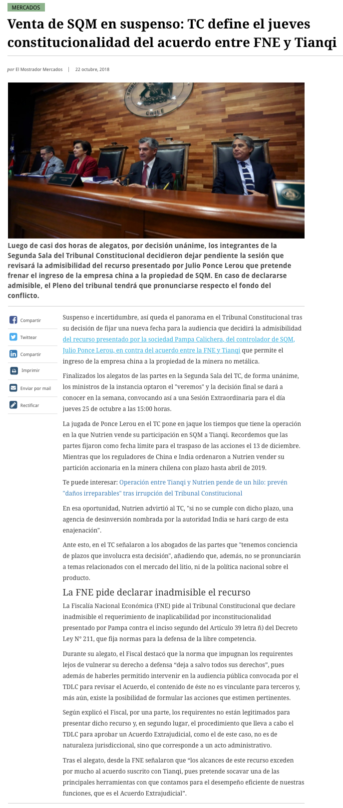 TC aplaza fallo por venta de SQM, en medio de acusaciones de instrumentalización del tribunal - (Pulso)
