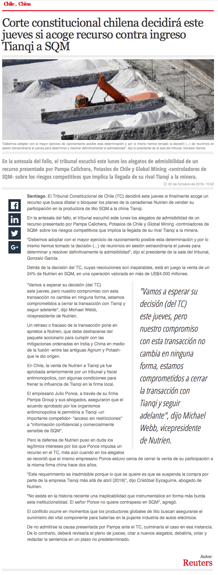 Venta de SQM en suspenso: TC define el jueves constitucionalidad del acuerdo entre FNE y Tianqi - (El Mostrador)