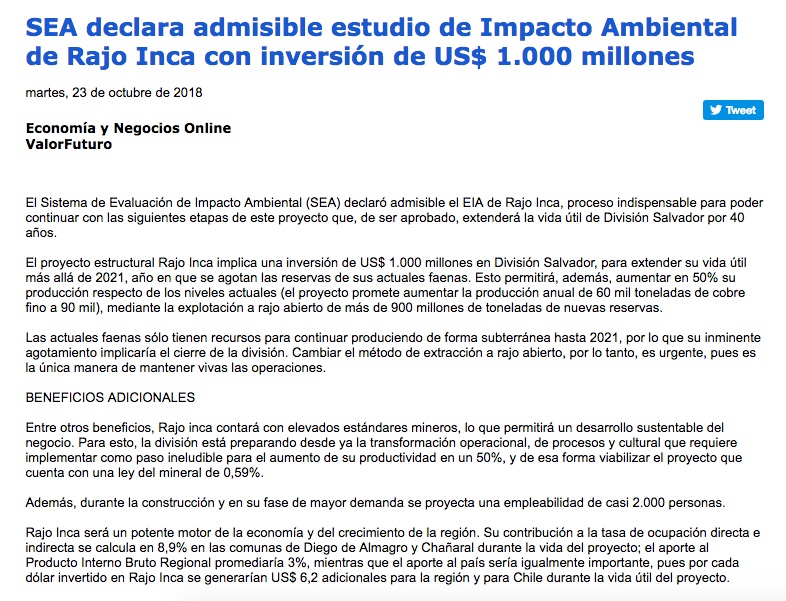 Estudio de Impacto Ambiental de Rajo Inca de Codelco es acogido a trámite por el SEA - (Estrategia)