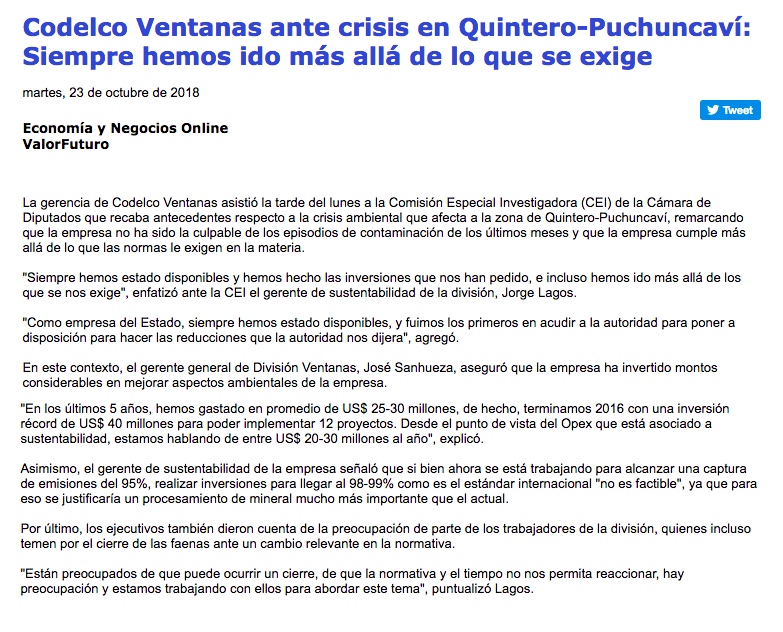Codelco Ventanas descarta responsabilidad en emisiones - (El Mercurio de Valparaíso)