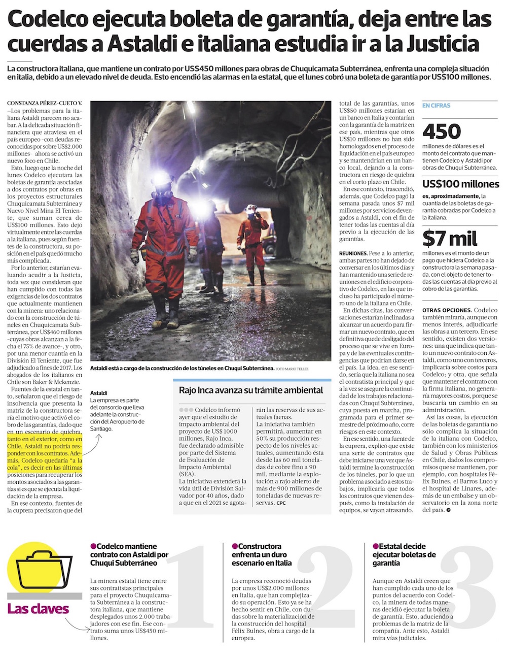 Codelco se resguarda y hace efectiva boleta de garantía de Astaldi por US$ 62 millones - (El Mercurio de Santiago)