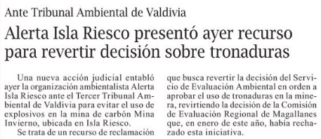 Alerta Isla Riesco presenta recurso para revertir aprobación de uso de explosivos en Mina Invierno - (El Mostrador)