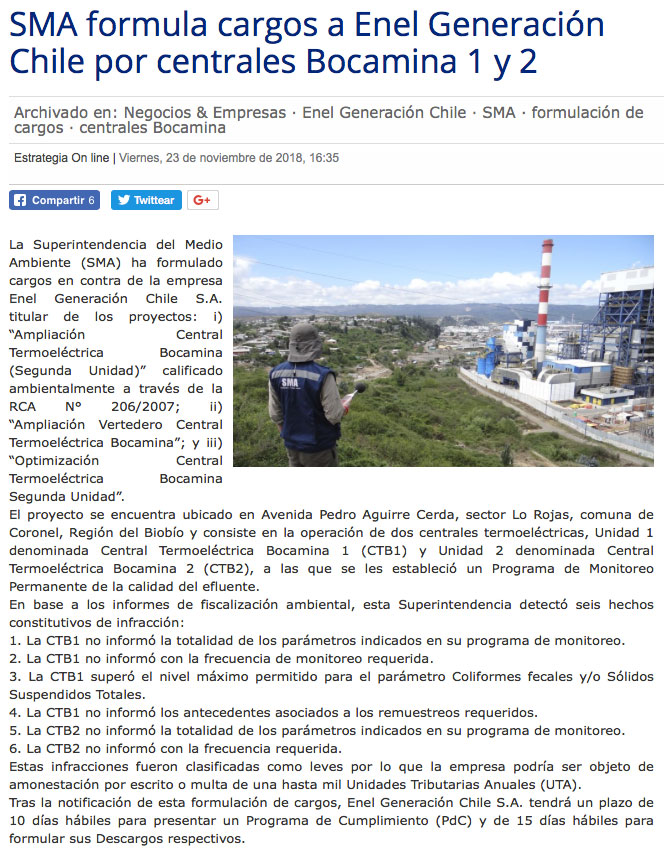 SMA levanta cargos contra central Bocamina - (El Mercurio de Santiago)