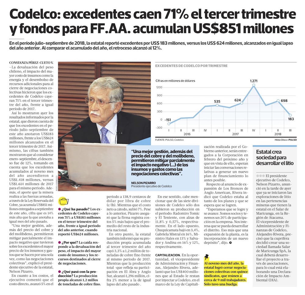Excedentes de Codelco caen 12% por alza en costos y llegan a los US$ 1.418 millones - (Diario Financiero)