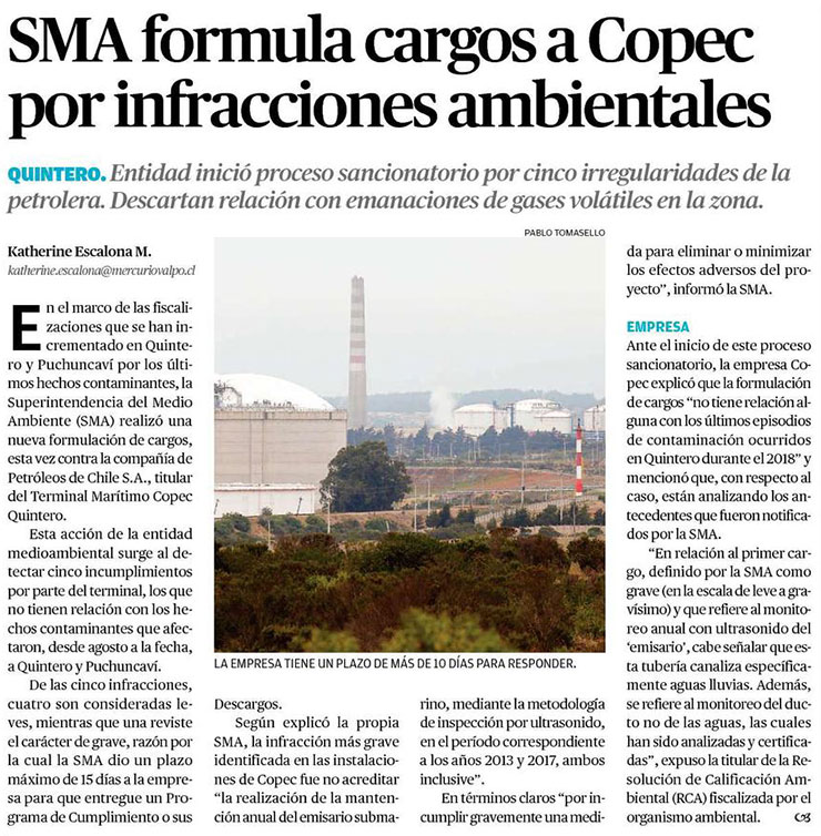 SMA levanta cargos contra terminal de Copec en Quintero - (El Mercurio de Santiago)
