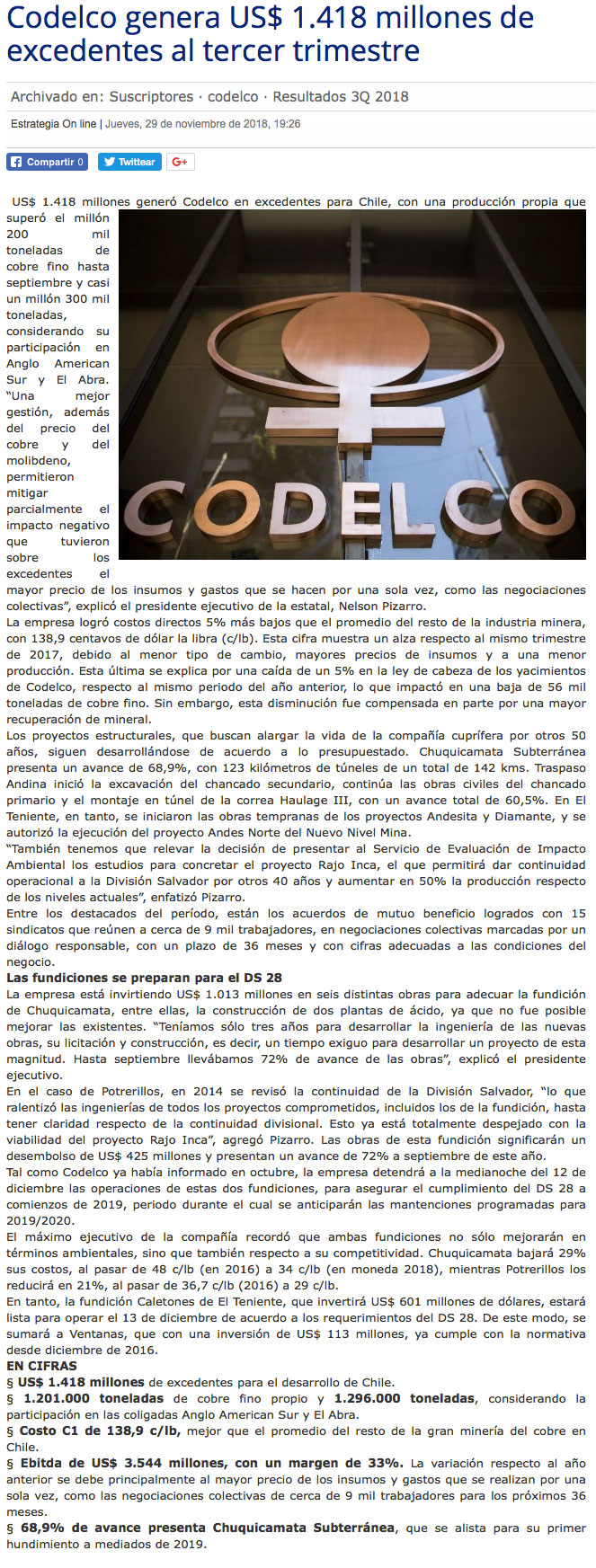 Excedentes de Codelco caen 12% por alza en costos y llegan a los US$ 1.418 millones - (Diario Financiero)