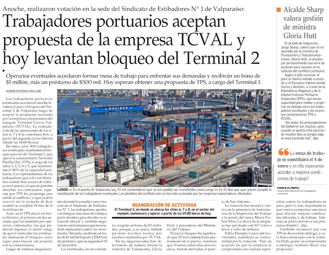 Conflicto portuario comienza a destrabarse: trabajadores eventuales de Tcval deponen paro en terminal 2 - (biobiochile online)