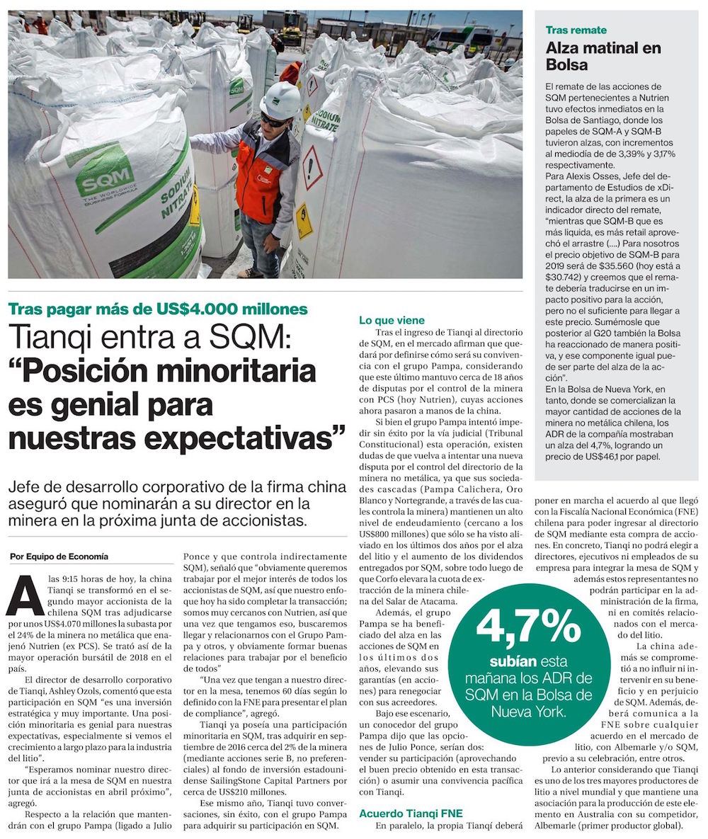 China Tianqi entra en SQM tras la mayor operación en la historia de la bolsa - (Medios Regionales Cadena El Mercurio)