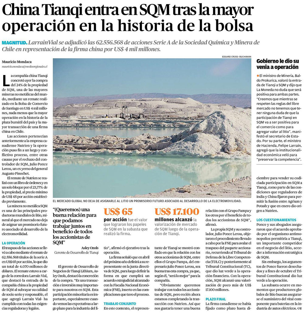 Tianqi entra a SQM: “Posición minoritaria es genial para nuestras expectativas” - (La Segunda)